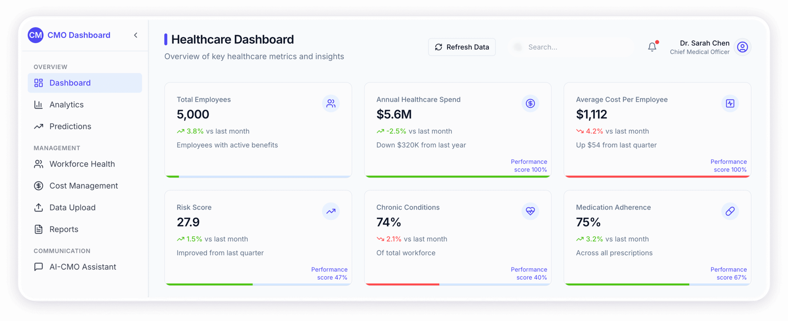 AI-CMO is our flagship AI-based Clinical Management Optimization tool that empowers employers and insurers to evaluate and manage health benefits intelligently, predict high-cost claimants using predictive modeling, gain real-time insights into employee health trends, and simplify complex data across providers and plans.